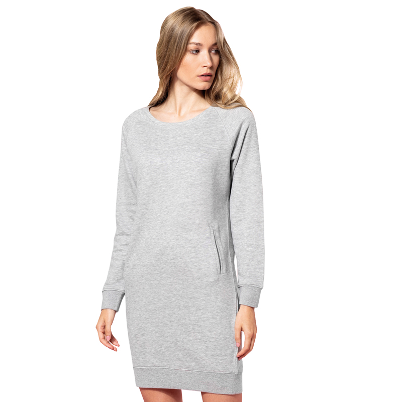 Pohodlné teplákové šaty z certifikované bio bavlny s kulatým výstřihem, raglánovými rukávy a bočními kapsami. Díky vyšší gramáži jsou ideální na chladnější dny třeba k legínám.